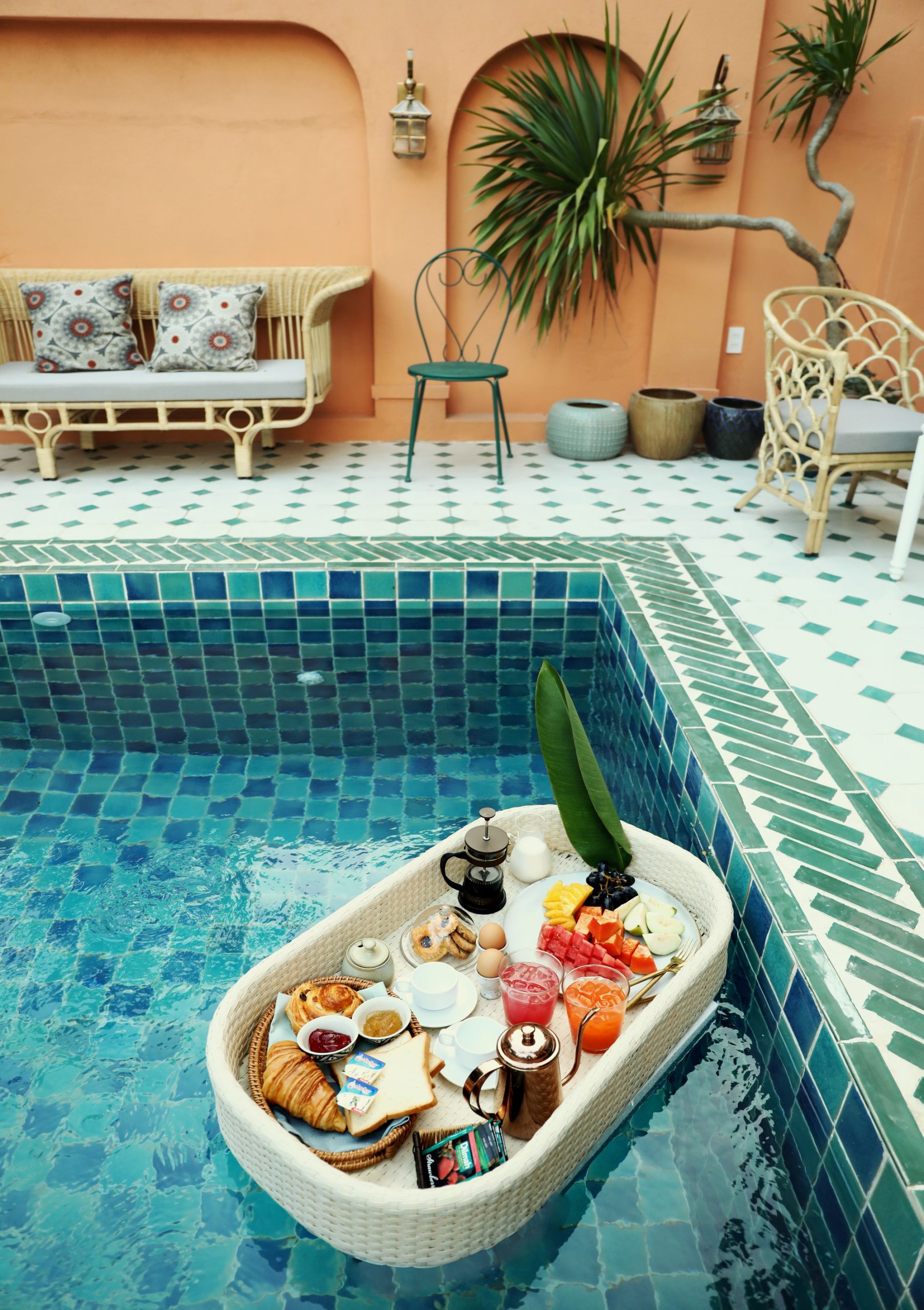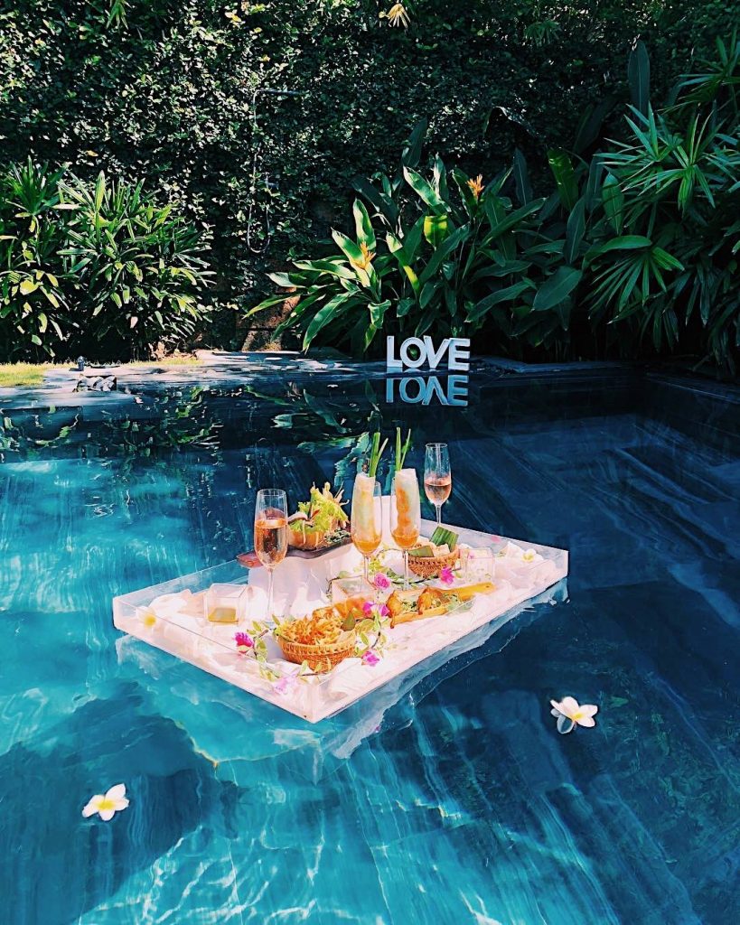 Floating Breakfast là gì mà hot đến vậy? Đây là một ‘trend’ bắt nguồn từ các resort, khách sạn cao cấp ở Bali, Indonesia. Nói một cách dễ hiểu thì ‘floating breakfast’ là bữa sáng nổi khi buổi ăn sáng của bạn được bày trí một cách đẹp mắt trên một chiếc khay nổi giữa hồ bơi. Tùy theo từng resort khác nhau mà thực đơn món ăn khác nhau, có nơi sẽ kết hợp món Âu và trà hay cà phê và có nơi sẽ phục vụ cả rượu vang cho bạn nữa đấy 🍷